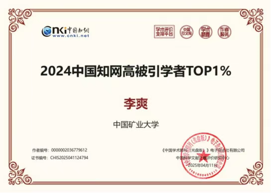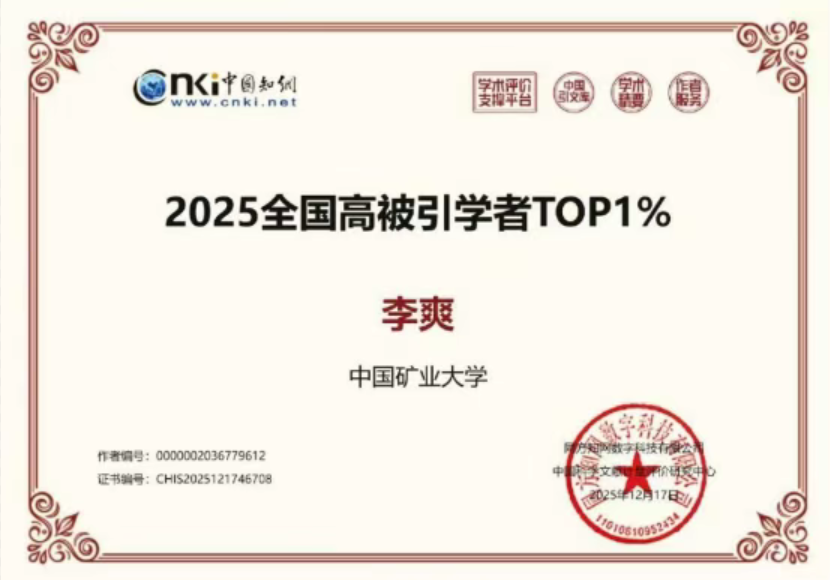 近日,中国知网正式发布“2025全国高被引学者”名单,李爽教授再次入选“全国高被引学者TOP1%”。自2024年该榜单首次设立以来,李爽教授已连续两年获得此项荣誉,充分彰显了其学术成果在国内安全科学与工程领域的深远影响力与持续引领地位。