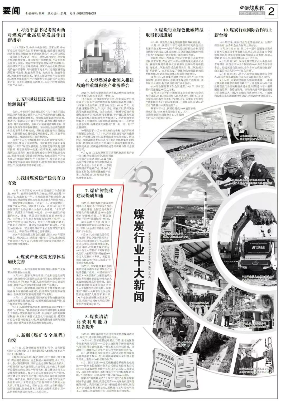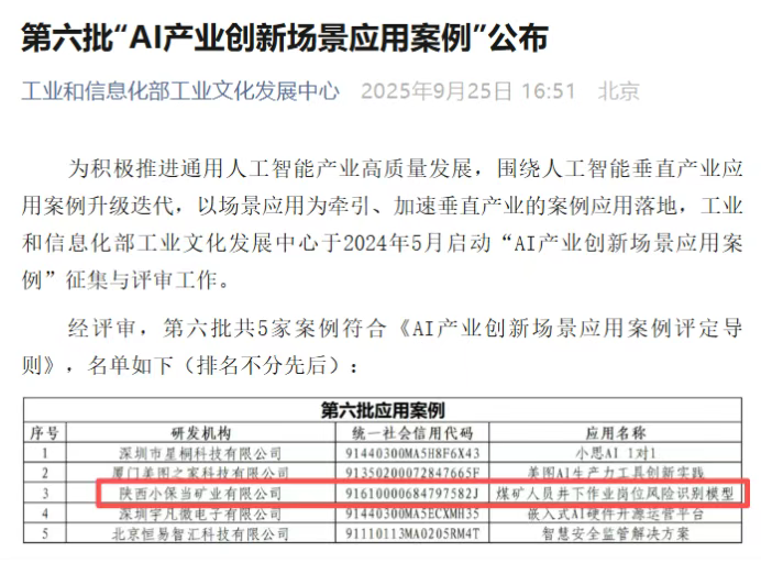 近日,中国煤炭工业协会与中国煤炭报联合发布2025年度煤炭行业企业科技十大新闻。其中,“‘煤矿人员井下作业岗位风险识别模型’入选国家第六批‘AI产业创新场景应用案例’”,入围2025年度煤炭科技十大新闻。