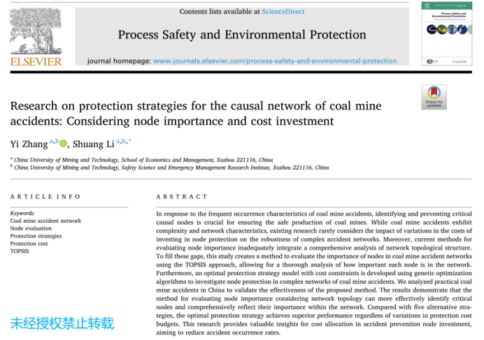 李爽教授团队研究成果“煤矿事故网络防护策略研究:考虑节点重要度和成本投入”在国际权威学术期刊《Process Safety and Environmental Protection》上发表。该刊是SCI JCR Q1、中科院TOP和中国科协安全科学领域高质量科技期刊T1级期刊,影响因子7.8。
