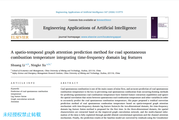 近日,李爽教授团队研究成果“融合时频域滞后特征的煤自燃温度空时图注意力预测方法”在中科院一区TOP期刊《Engineering Applications of Artificial Intelligence》发表。该刊是人工智能工程应用与复杂系统建模领域高水平国际学术期刊、影响因子8.0。该成果通过创新引入“自适应滞后窗口”概念,并设计双注意力机制驱动的时空图预测模型,实现了煤自燃温度动态预警与多源特征融合方面的重要科研突破。