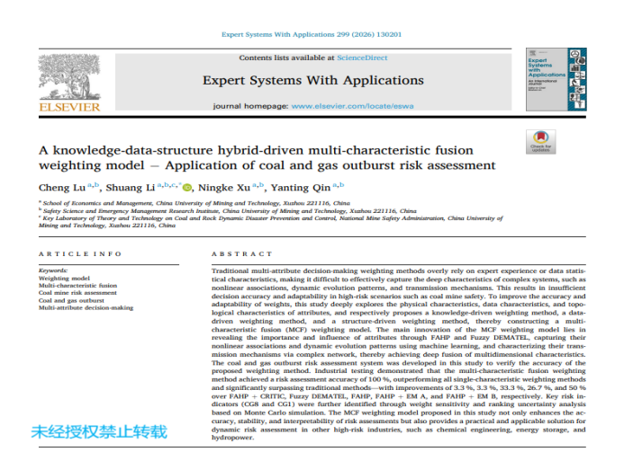 这是团队继瓦斯浓度动态预测成果之后,在矿井风险智能管控领域的又一重要突破,也是国家自然科学基金重点项目“煤矿灾害环境人员生命体征演变与智能保障的基础研究”的成果之一。凭借着优秀的创新性和应用价值,目前,该成果已被国际运筹与管理科学领域顶级期刊《Expert Systems with Applications》录用。该刊是中科院一区TOP期刊,影响因子7.5,在行业内享有极高的声誉。